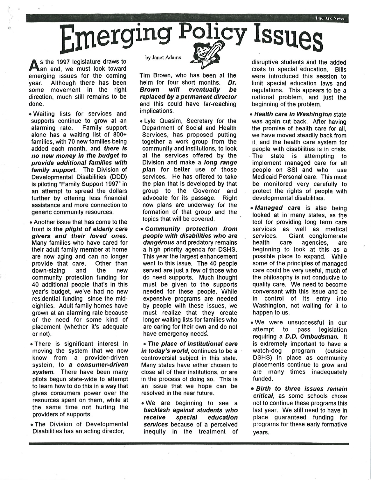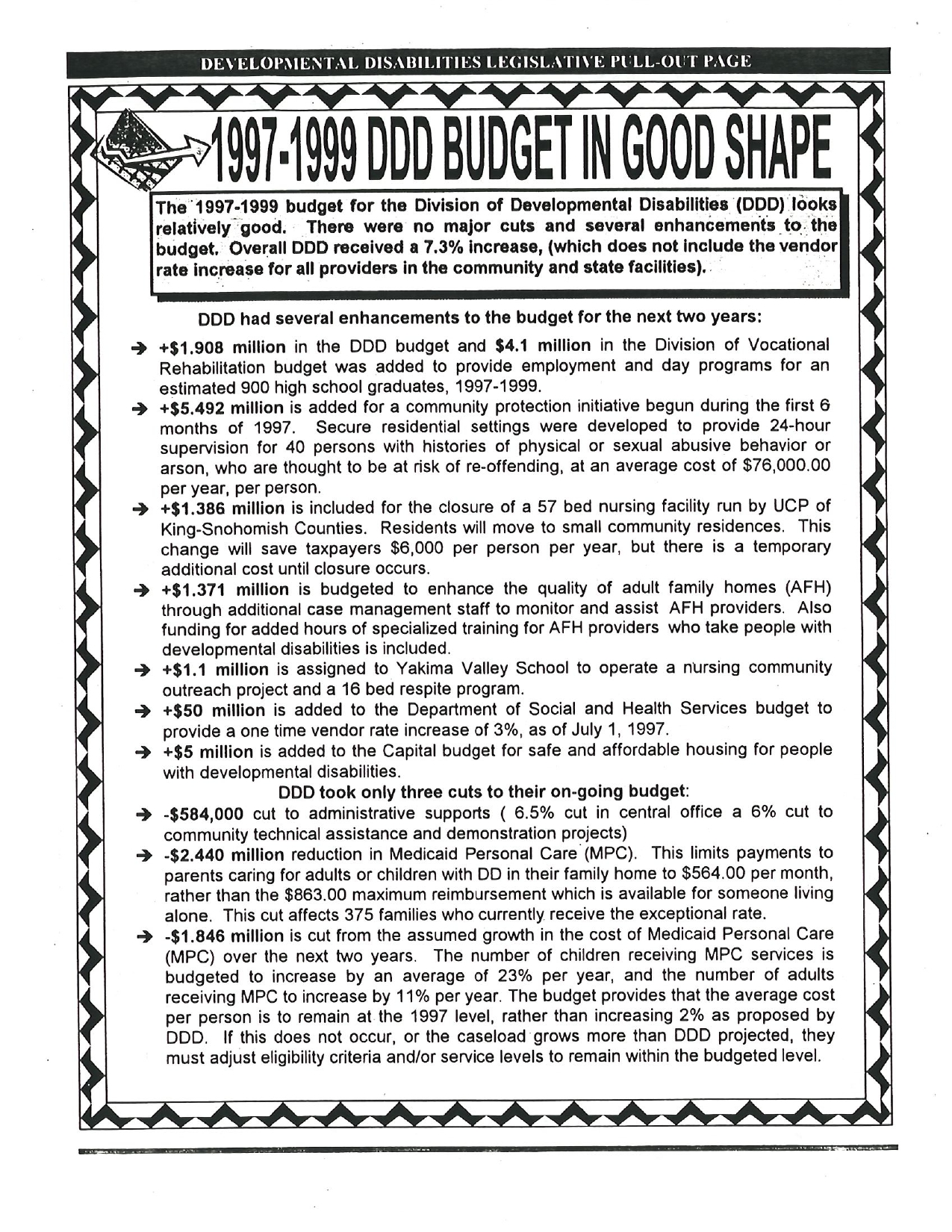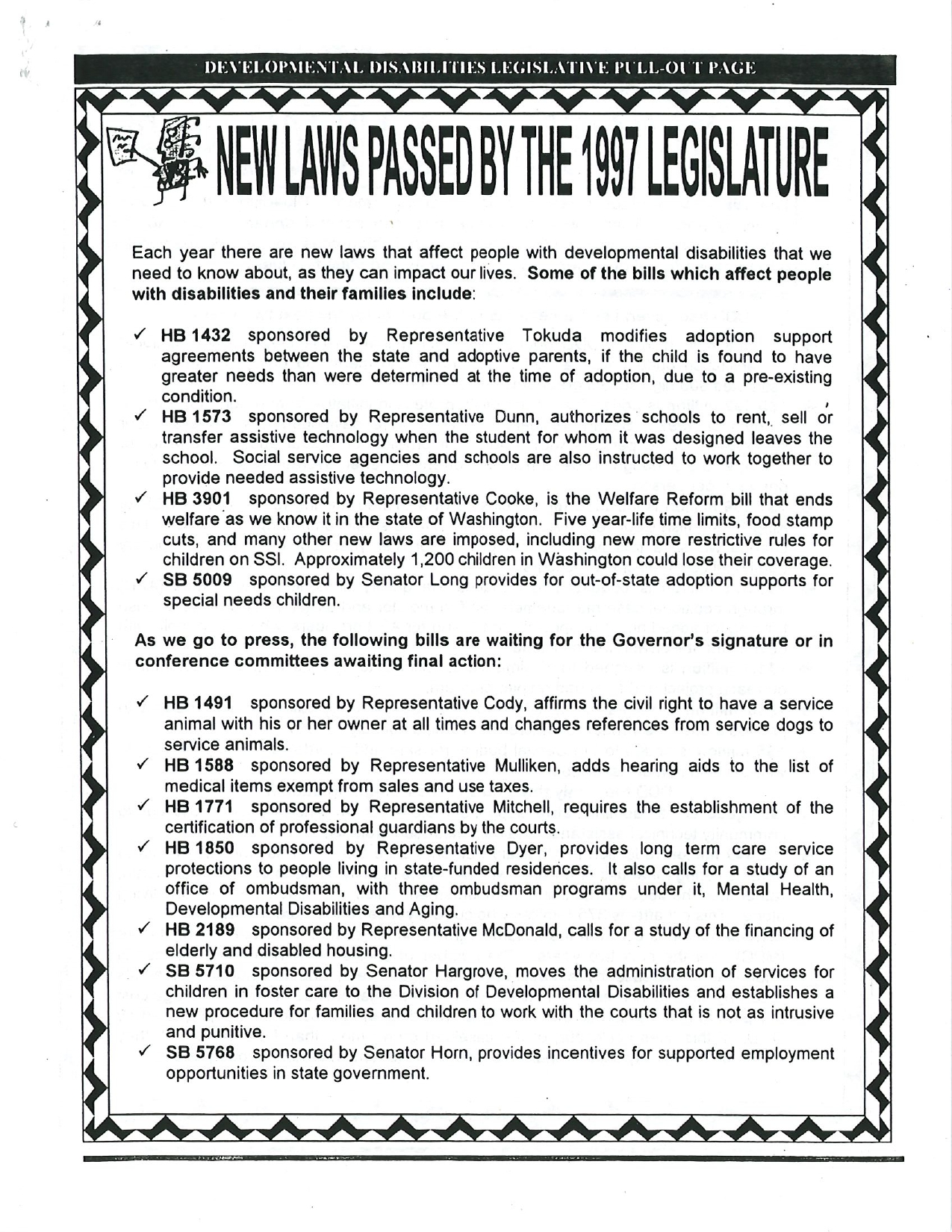 The 1997 Legislative Session marked an important step forward for people with developmental disabilities and their families in Washington State. New laws strengthened adoption support, expanded access to assistive technology, and provided funding for vital programs such as community protection, adult family homes, and supported employment. Lawmakers also approved a 7.3% budget increase for the Division of Developmental Disabilities, helping address critical needs in housing, services, and long-term supports.